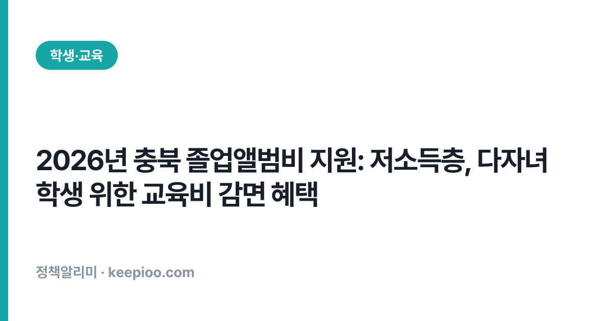 2026년 충청북도 졸업앨범비 지원은 저소득층, 한부모, 다자녀 학생들의 교육비 부담을 덜어주는 복지 정책입니다. 졸업앨범 제작 비용을 감면하여 학부모의 경제적 어려움을 경감하고 교육 기회를 제공합니다. 신청 자격과 방법을 확인하여 필요한 지원을 놓치지 마세요.